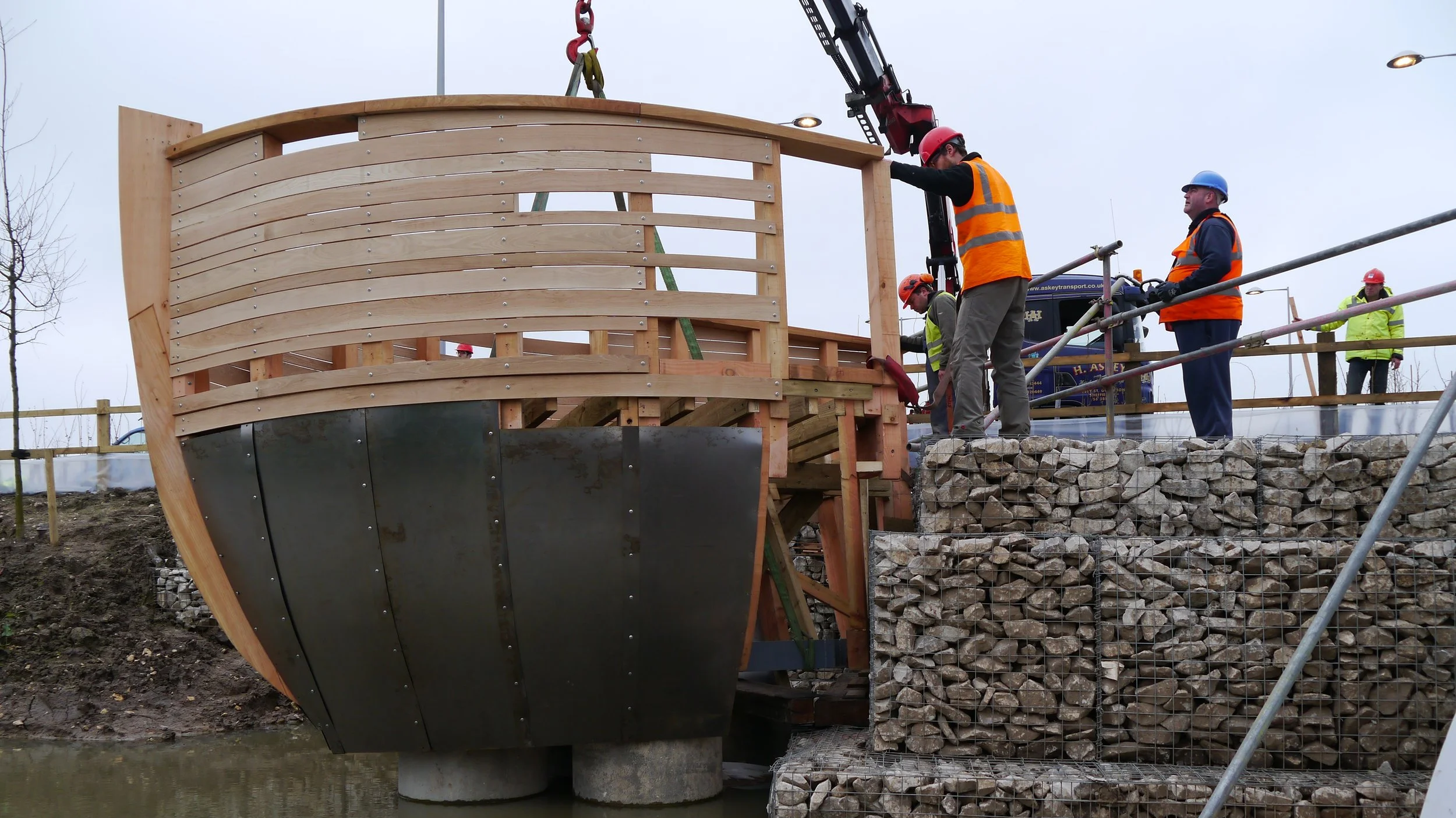 Two sculptural jetties crafted from British oak draw on the Viking heritage of the York site, referencing historic river travel, boatbuilding, and timber construction. Installed within a sensitive wetland landscape, the structures were carefully engineered to accommodate fluctuating water levels and soft ground conditions. The jetties were assembled and craned into position over the river, minimising environmental impact while reinforcing their close relationship to the water and surrounding ecology.