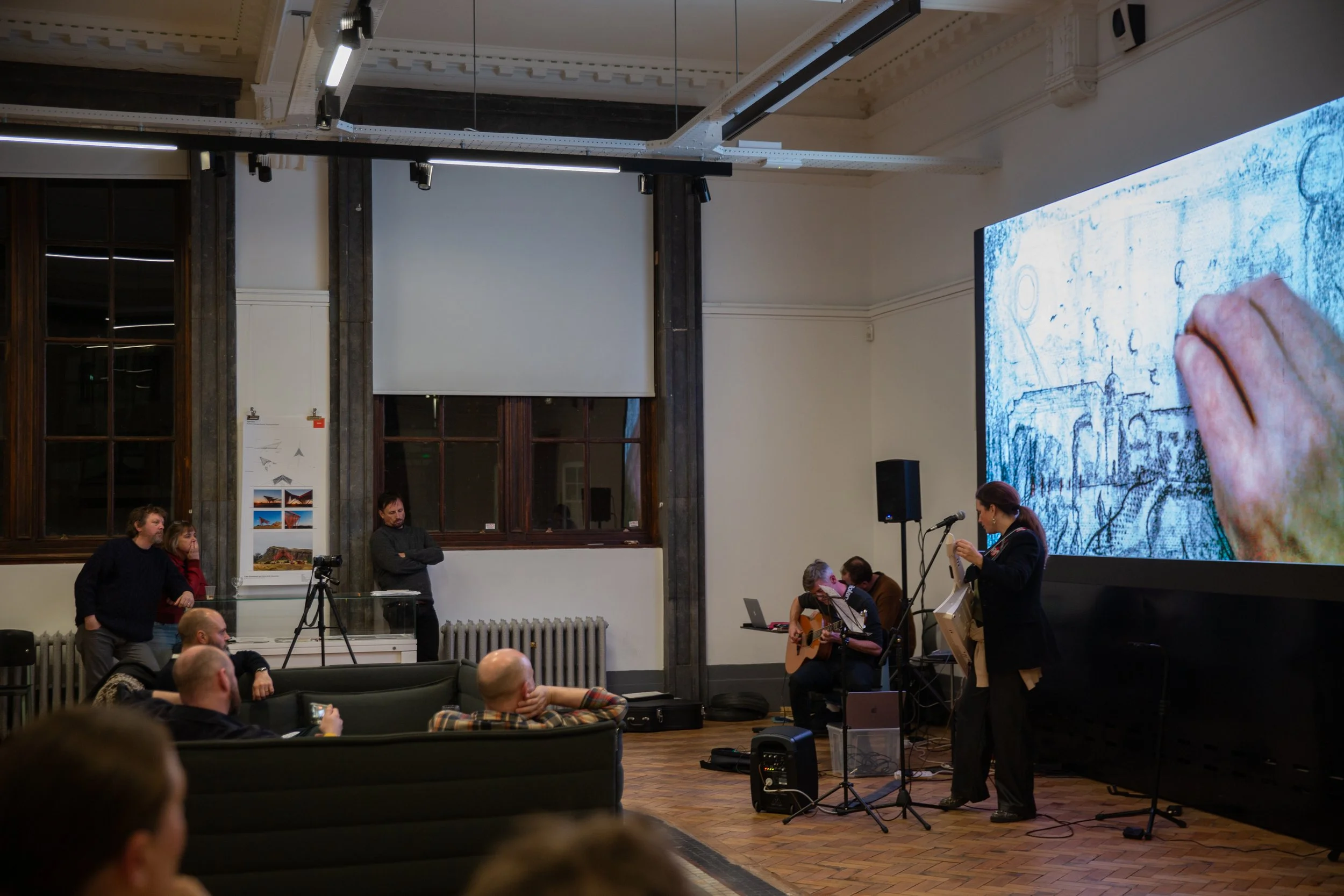 Carbon Copy was an audio-visual remix of Sheffield’s former Head Post Hall. Created in collaboration with Lost Chimes, it was a site-specific performance responding to the building’s architecture. The music and lyrics drew on its history and past occupants, while the performance was accompanied by live drawing that visually interpreted and reacted to the space in real time.